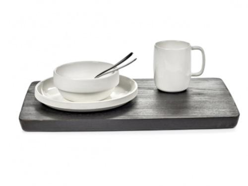 Een rechthoekig gecarboniseerd theeblad waarop perfect een theepotje en glas kan geplaatst worden of een gerecht en thee in glas op voet.